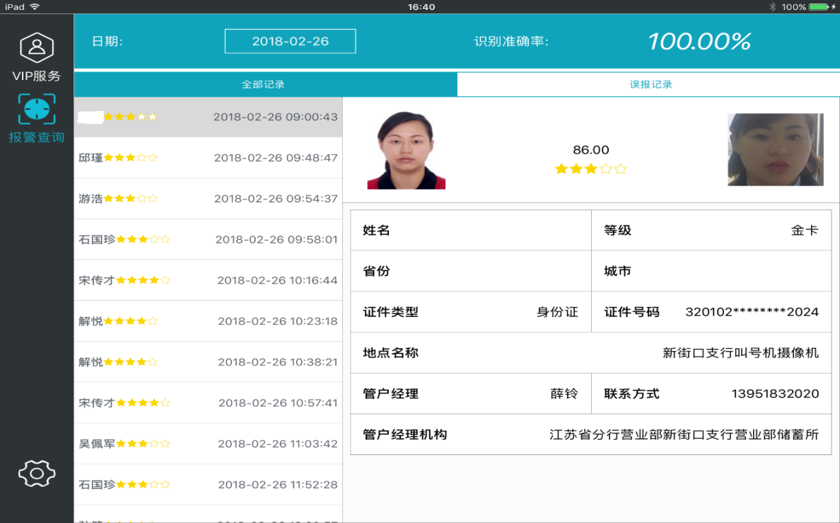 系统通过对银行入口处或机器人识别到的人员的人脸图像进行抓取分析,与预先保存的VIP客户人脸模板进行比对,第一时间识别出到访的 VIP 客户,通过短信、手持设备信息推送等方式,及时将 VIP 客户到达信息发送给相应的客户经理,并可以通过语音方式欢迎 VIP 客户的光临。客户经理收到相应信息后,可立即出门迎接,做出精准的定位营销,让客户体验到银行更好的服务,支持对接机器人系统,下发客户信息,由机器人进行主动迎宾。